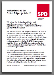 Wir haben den Bestand von Kinder- und Jugendeinrichtungen der Freien Träger der Jugendarbeit gesichert – sie bekommen 2009 die gleichen Mittel wie 2008! Der Hauptausschuss des Abgeordnetenhauses hat das am Mittwoch, dem 10.12.2008, bestätigt. Das ist eine gute Nachricht für alle, die sich in unserem Bezirk sozial engagieren und vor allem für die, die diese Leistungen brauchen und nutzen. Wir als SPD stehen an Eurer und an Ihrer Seite und haben in den vergangenen Wochen für den Fortbestand gekämpft!