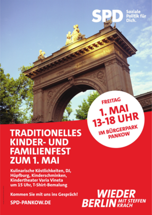 Wir laden zu unserem traditionellen Kinder- und Familienfest am Freitag, dem 1. Mai 2026, im Bürgerpark auf der Festwiese ein (Leonhard-Frank-Straße, Nähe Kinderbauernhof Pinke-Panke).